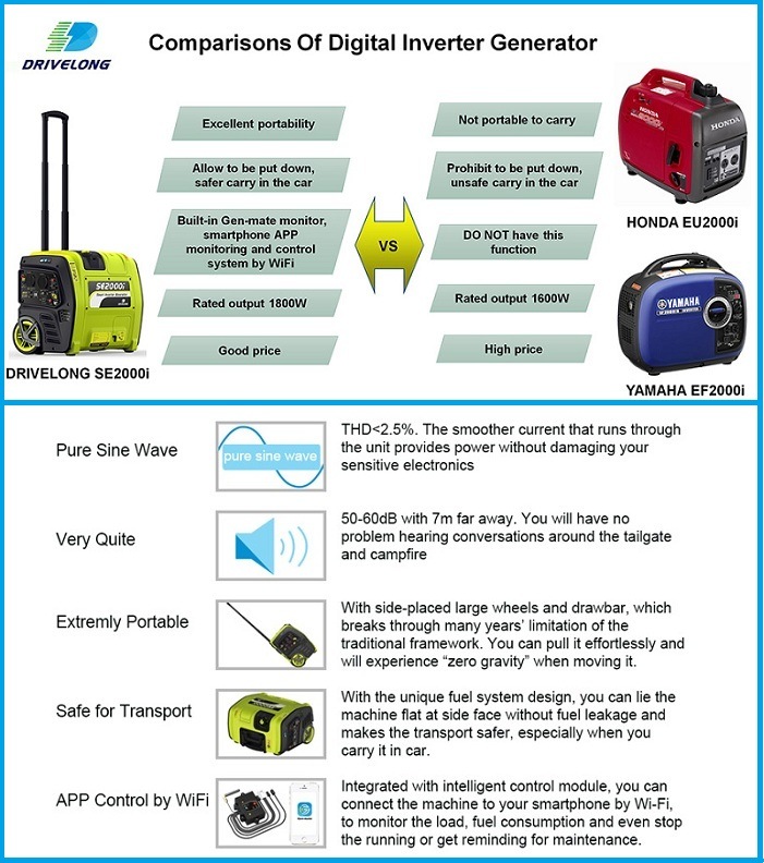 Benzin-Generator mit maximaler Ausgabe von 2000w, die laufende Ausgabe 1600w, SE2000i von DRIVELONG ist fü R Ihren RV, Ihre kampierende Reise, ein Wochenende von Tailgating, von im Freienprojekten und als Quelle der backupenergie wä Hrend einer Dringlichkeit ideal. Verglichen mit traditionellen Generatoren im Markt, hat SE2000i offensichtliche Vorteile, auß Er seiner haltbaren und Kompaktbauweise.